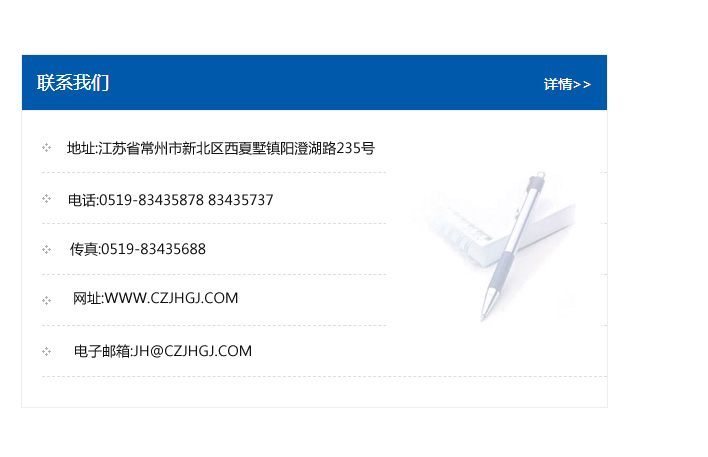 地址:常州市新北區友邦商務大廈1幢16、17層  電話:0519-85101652  傳真:0519-85112595  郵編:213022  網址:www.cz-jiayue_cn.shahua1.com  郵箱:xiajifengaa@163.com